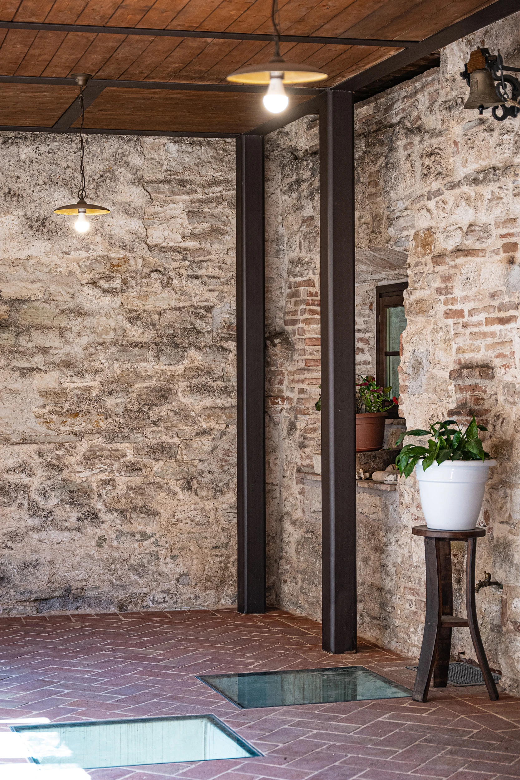 The intervention also included the reconstruction of buildings that collapsed following the 1997 earthquake, along with the resolution of static and seismic interactions between adjacent buildings and between historic structures and newly constructed volumes. The project further involved the vertical extension of the existing refectory and the construction of a new bell tower, ensuring structural compatibility and respect for the architectural character of the complex.